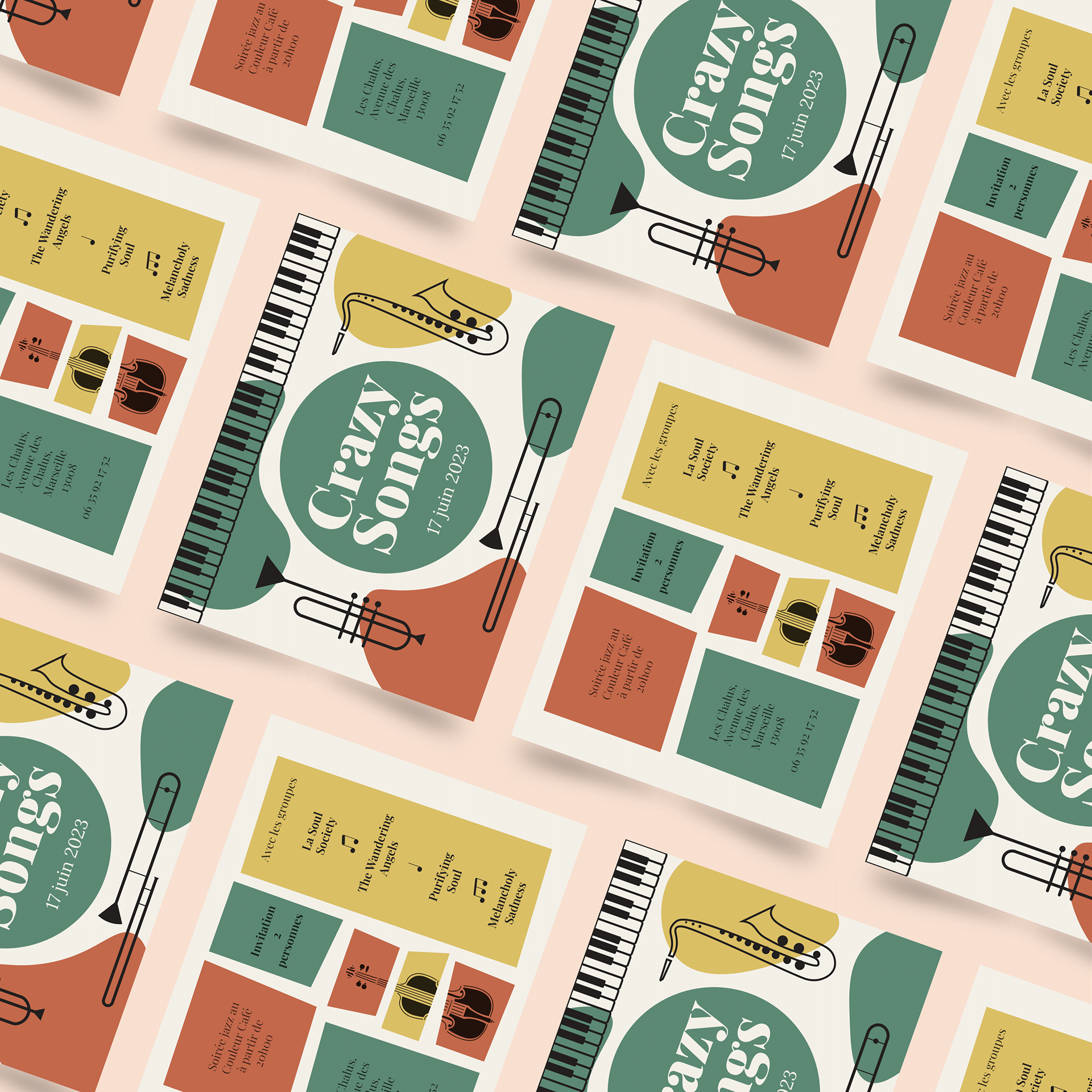 L’univers graphique repose sur des formes stylisées d’instruments (saxophone, contrebasse, batterie…) déclinées en aplats de couleurs vives (vert, jaune, rouge-orangé), pour transmettre l’énergie et la chaleur d’un concert live.