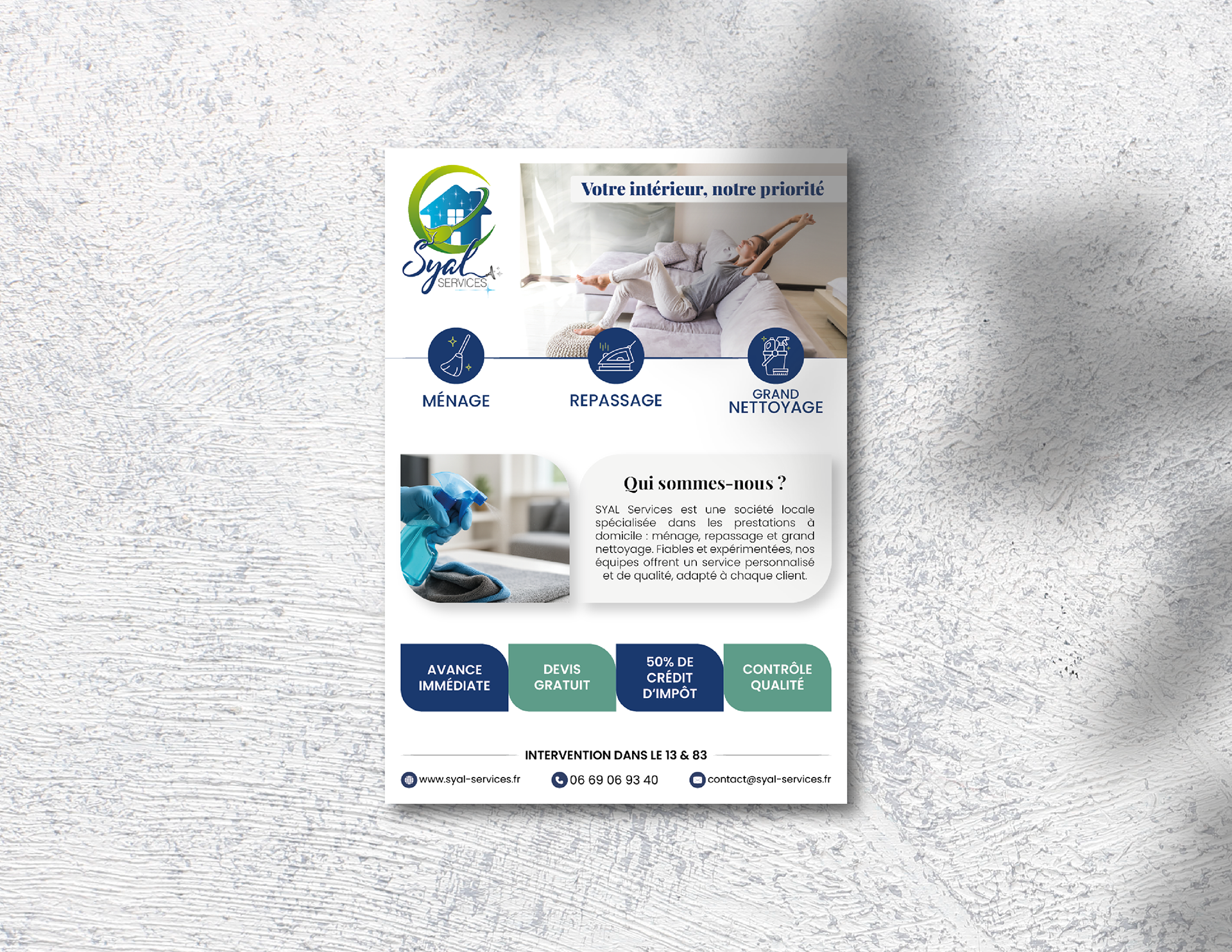 Ce flyer a été conçu pour SYAL Services, une société locale dans les prestations à domicile : ménage, repassage et grand nettoyage.